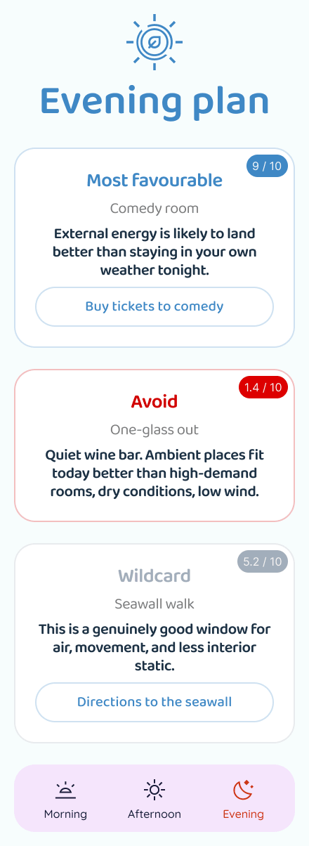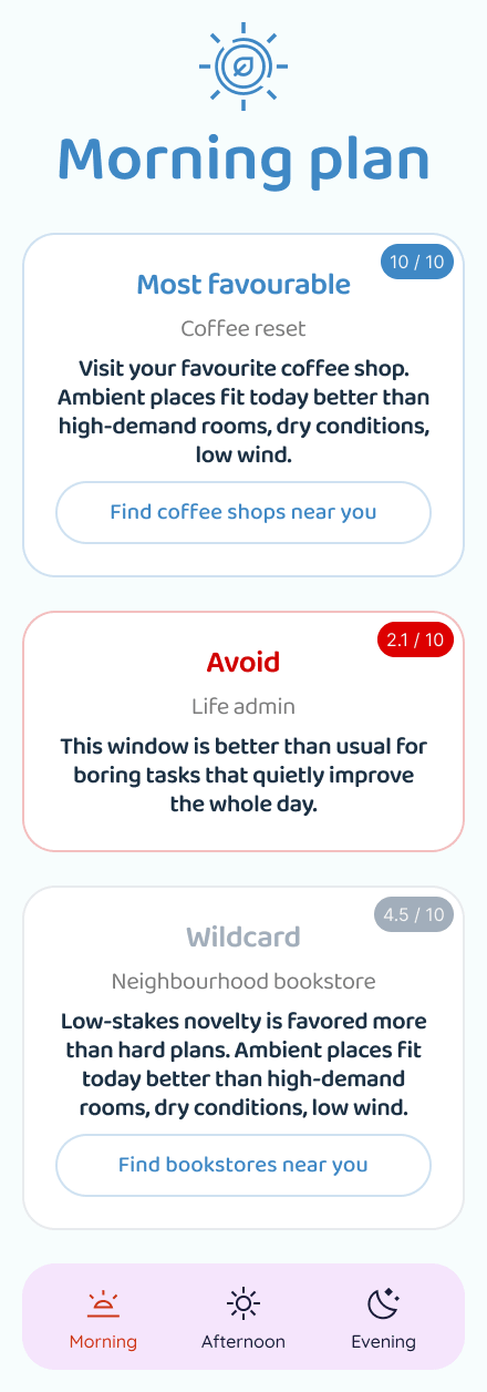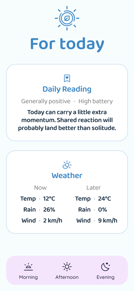 Favourable keeps the experience intentionally light: four simple emotional states, time-aware guidance, low-effort rituals and a soothing interface that avoids pressure. It helps users shift their day through small, meaningful actions such as reflection, movement, rest, connection or gentle reset moments. The product can also become more adaptive through automated context data, making it feel responsive without asking users to constantly explain themselves.